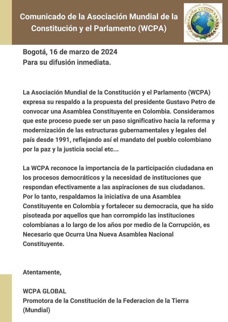 Reunión con WCPA GLOBAL y el Movimiento Nacional una Colombia Soberana sin Victimas Derechos Humanos y Colombia Humana, Sobre la Importancia de Reemplazar a las Naciones Unidas, el papel que juega Colombia en el tema y porque La Federación de la Tierra bajo la Constitución Mundial hace respetar los derechos humanos y el medio ambiente etc .....